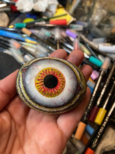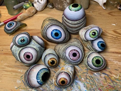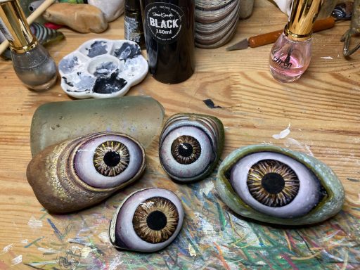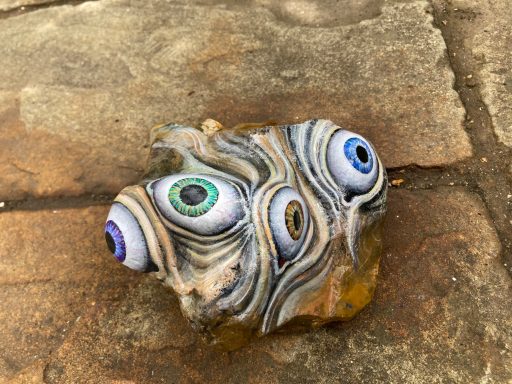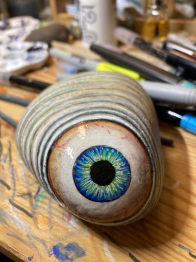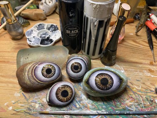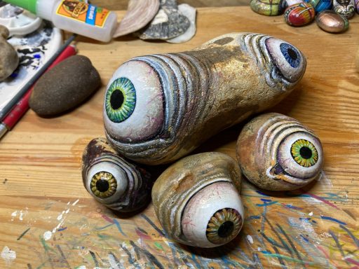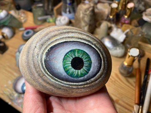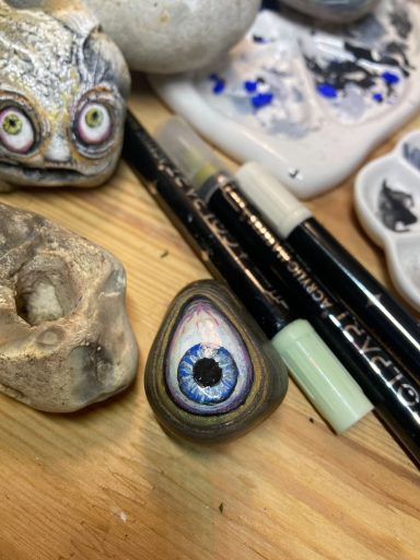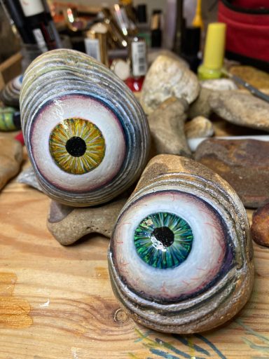 Global project painting eyes on rocks and found objects. Placing those objects around the world into situations and landscapes for people to find and contemplate. Human connection is forged through the eyes via eye contact, a powerful form of non-verbal communication that conveys emotion, fosters empathy, and builds trust. Our eyes on the world; in the rocks, in the objects around us, in the landscapes around us. People can keep, leave, or redistribute the eyes that they find.
