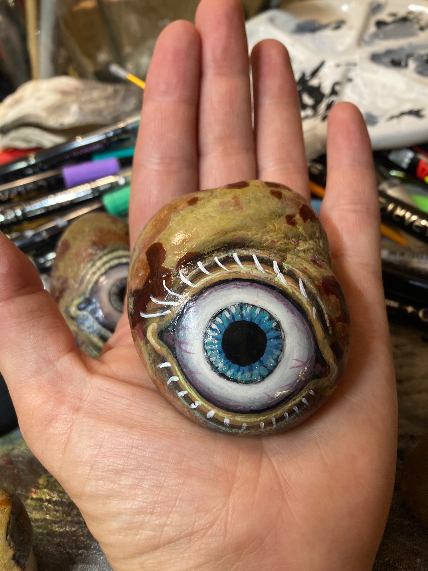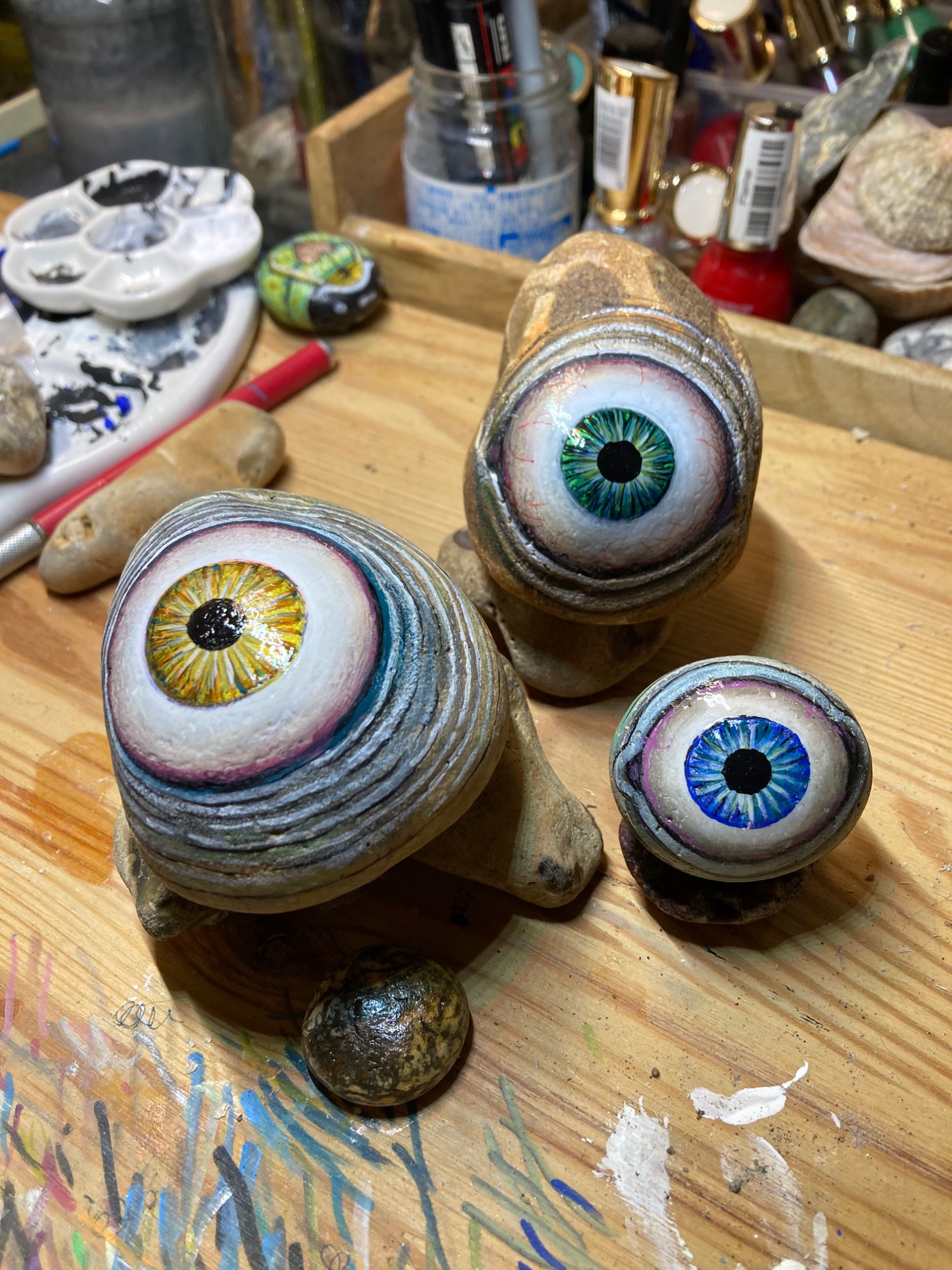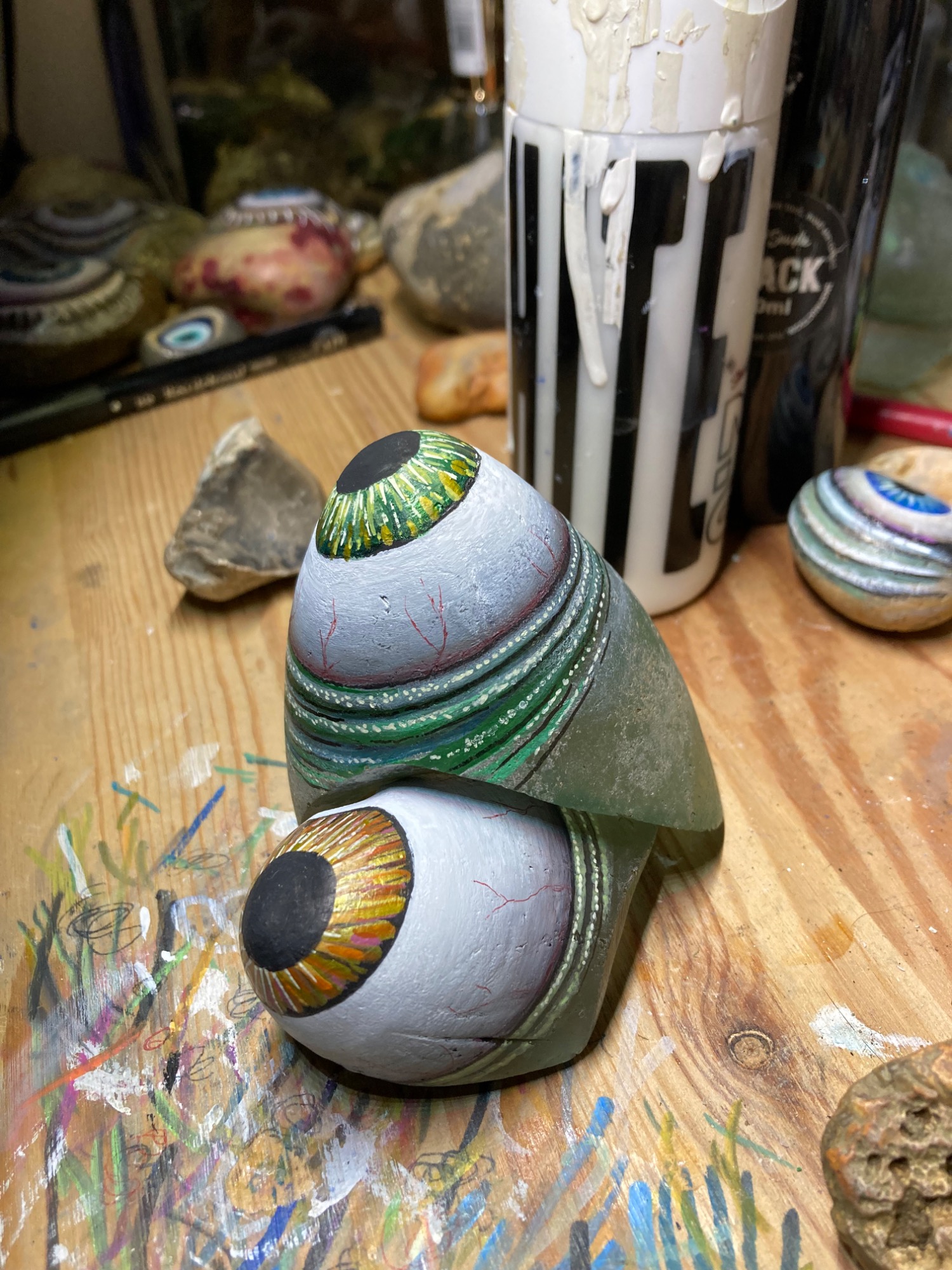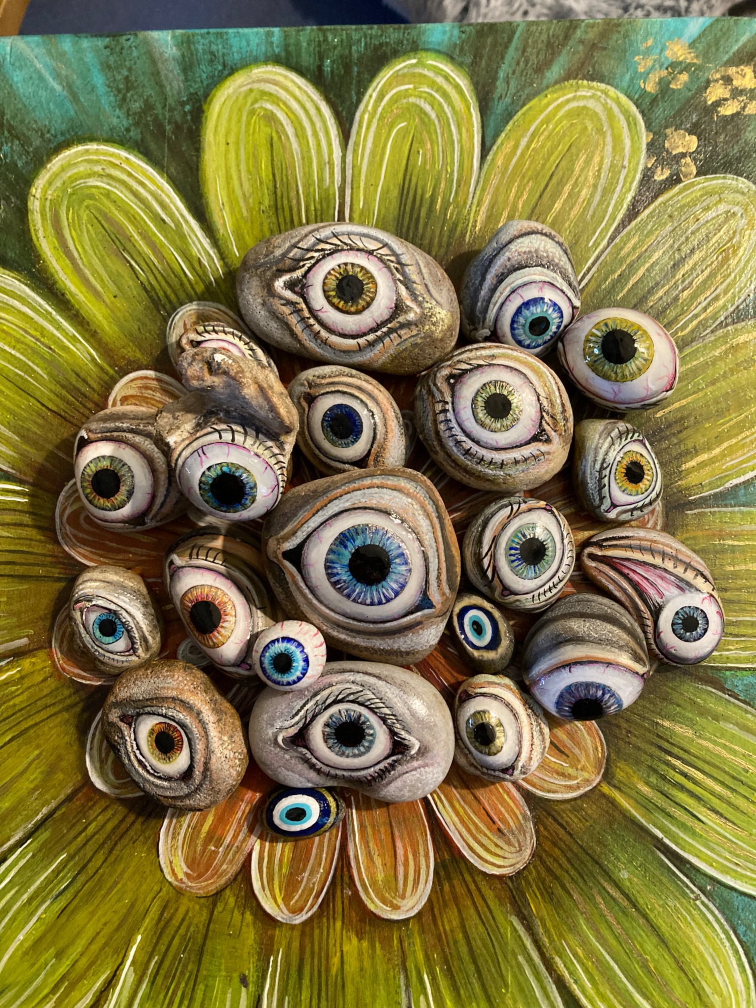 Global project painting eyes on rocks and found objects. Placing those objects around the world into situations and landscapes for people to find and contemplate. Human connection is forged through the eyes via eye contact, a powerful form of non-verbal communication that conveys emotion, fosters empathy, and builds trust. Our eyes on the world; in the rocks, in the objects around us, in the landscapes around us. People can keep, leave, or redistribute the eyes that they find.